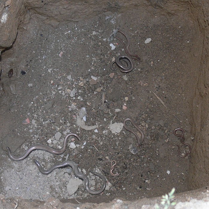 Tak nám do jámy nachystané na nové odpady přibyli hosté, včetně malého miminka. Ty dvě tlusté jsou asi budoucí matky. Odnesli jsme je všechny do nově vybudovaného slepýšího sídliště.