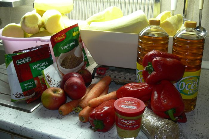 Smíchat, zalejt. Protože zítra (dneska) jedu do Prahy tak to nechám den uležet na balkóně a zítra se uvidí (jeden recept říká sterilovat hned, druhý sterilovat za den a ten poslední až za tři dny, tak uvidíme). Musím ovšem dodat že mi to hodně chutná i syrové, jakože syrové neochucené dýně ani cukety na podzim mi připadají poměrně hnusné. Asi by se to dalo jíst i jako salát, zítra uvidíme.