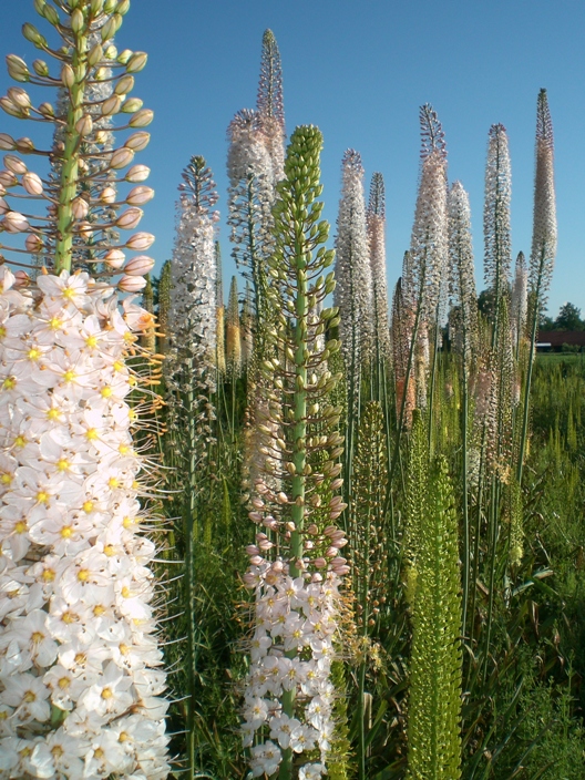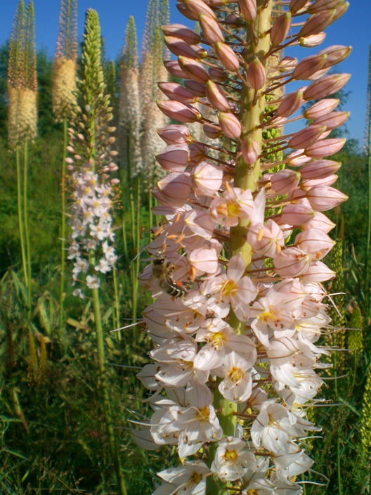 Jen dodám ještě,že Eremurusů je mnoho druhů.Nejznámější u nás mezi zahrádkáři je asi Eremurus stenophyllus /Liliochvostec úzkolistý/ Žluté až 160 cm vysoké květenství a Eremurus robustus /Lilichvostec statný/ se smetanově bílým až narůžovělým květenstvím dosahujícím výšky až tři metry.Květenství Eremurusů je dlouhý hustý klas(u robustus a až 1m) složený z kvítků,který nekvete celý naráz,nýbrž postupně odspodu vzhůru.Je to proto ,aby nedošlo k sebeopylení každého z kvítků.Blizny kvítků se objeví vždy až ztratí své tyčinky a začnou zasychat.K opylení pak dojde z právě nakvítajících dalších kvítků v klase nad nimi,které mají ještě jen tyčinky.V jednom květenství tak lze běžně spatřit různé fáze vývoje květu.Ve spodní části jsou už zahnědlé zrající semenáčky a na špici má květenství ještě poupata.Při pohledu na celé květenství to evokuje představu jako kdyby postupně hořelo ,podbně jako prskavka.Možná i proto je někdy lidmi přezdíván ve své domovině "Pouštní svíce".Dá se množit semeny/dobře klíčí/ a rovněž vegetativně /rozdělěním hlíz/.Rostlina ze semen však začíná kvést až po několika letech.Hlíza má středový pupen/pupeny/ z něhož do stran paprskovitě vyrustájí dužnaté kořeny.Hlíza tak trochu to připomíná "pavouka" či "chobotnici".Rostlina si dělá každé vegetační období celý kořenový systém nový a starý nechá uhnít pod sebou.Květy mají trochu nahořklou ,med připomínají vůni a jsou doslova neodolatelné pro čmeláky,včely a hmyz živící se pylem.Rostlina na zimu celá zatahuje a raší časně z jara.Je otužilá,houževnatá a nenáročná na pěstování.Lze ji najít i ve vyšších nadmořských výškách.Její domovinou /podle druhu/ jsou asijské stepy(Tádžikistan,Kirgistan,Čína,atd.) a pohoří (Pamír,Ťan-Šan,atd).