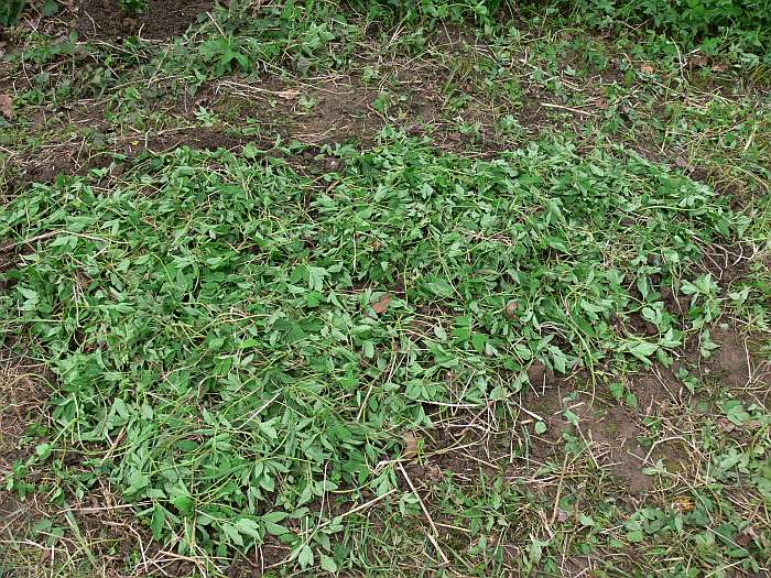 Takže jsem zasela quinou v kombinaci s červenou lebedou. Takhle vypadá záhonek, je to namulčované bršlicí která tam rostla předtím: