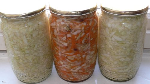 Tak jsem udělala tři sklenice, přesně podle návodu v odkazu v prvním příspěvku. Jako jedinou výjimku jsem přidala před uzavřením sklenic dvě lžíce šťávy z Tuřanského kysaného zelí. Dvě sklenice jsou bílé zelí, vyšlo to akorát na půlku střední hlávky. Krásně to pustilo šťávu. Do třetí sklenice jsem udělala směs nakrouhaného zelí (menší čtvrtka), jedné nastrouhané mrkve nahrubo, jedné cibule a jednoho žampiónu, obojí nakrájené.