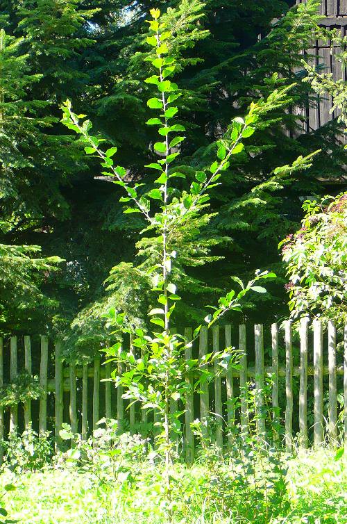 V roce 2009 začal nápadně rychle zesilovat kmen, tvořil se obrost na větvích, a jen trochu se prodloužil vrchol a konce větví. V půlce května se stromek za jediný den po silném dešti ohnul do pravého úhlu. Alespoň jsem ho mohl změřit - 320 cm. Neunesl váhu mokrých listů. Zatloukl jsem k němu kůl a kmínek k němu upevnil asi ve sto padesáti centimetrech. Část nad úvazkem zůstala skloněná (je to vidět na fotce s lopuchy na které to nevidíte) a zdá se že jedna větev převzala funkci vrcholového výhonu. Chtěl jsem stromek původně vyvázat do kolmé polohy, ale pořád byl na to čas. Možná že je dobře že jsem to neudělal, alespoň ho to ohnutí zpomalilo v růstu.