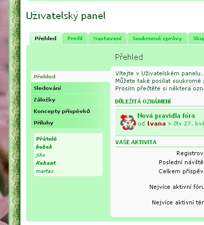 Uživatelský panel je rozdělen do šesti záložek: Přehled, Profil, Nastavení, Soukromé zprávy, Skupiny, Přátelé a nepřátelé. Na každé této kartě je několik podstránek, přístupné klepnutím na požadovaný odkaz na levé straně panelu (jednotlivé podstránky jsou v tomto příspěvku psány podtržené).