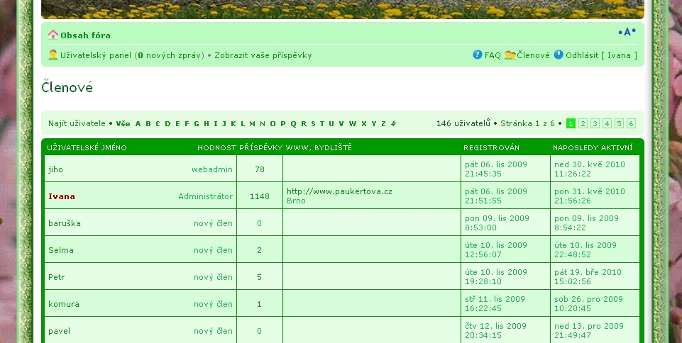 V seznamu můžete hledat kliknutím na písmeno - zobrazí se všichni s uživatelským jménem, které na něj začíná. Další možnost třídění je podle záhlaví sloupců jako je Hodnost, Příspěvky, Registrován - po kliknutí se seznam seřadí vzestupně, po dalším kliknutí se seřadí sestupně.