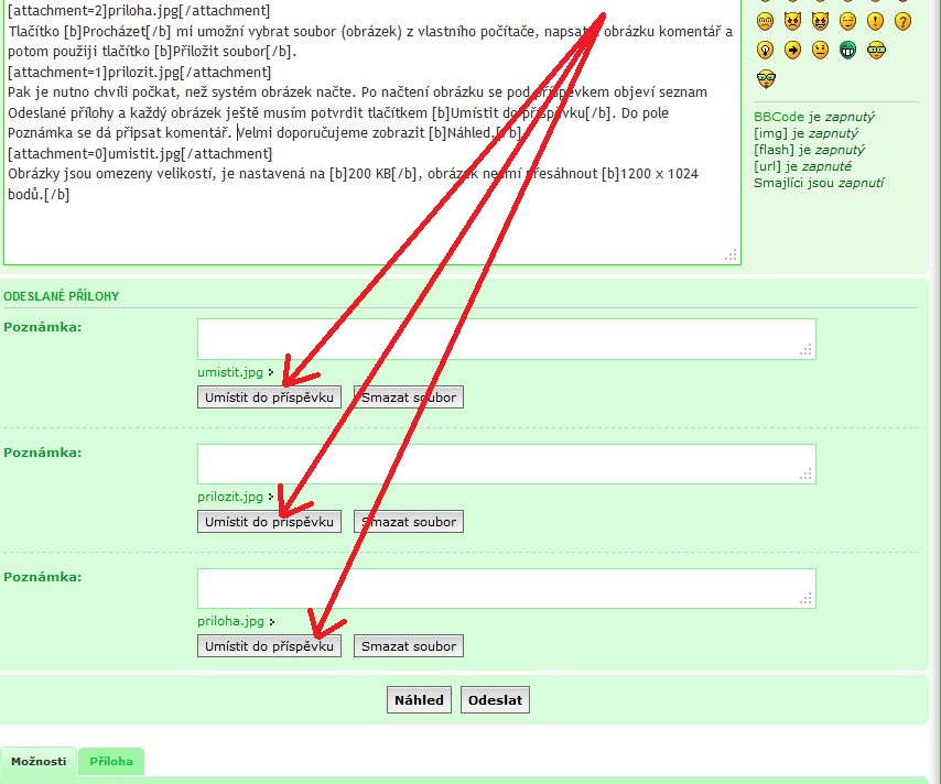 Pak je nutno chvíli počkat, než systém obrázek načte. Po načtení obrázku se pod příspěvkem objeví seznam Odeslané přílohy a každý obrázek ještě musím potvrdit tlačítkem