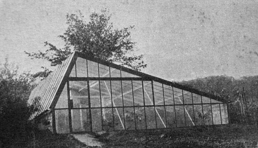 Skleník byl ještě poměrně hluboko zapuštěný do země, ve hřebeni měl snad 5 m výšku (ale to už si přesně nepamatuji). Na zimu Ing. Dobeš doporučoval zakrýt povlovně se svažující část balíky slámy k omezení tepelných ztrát.