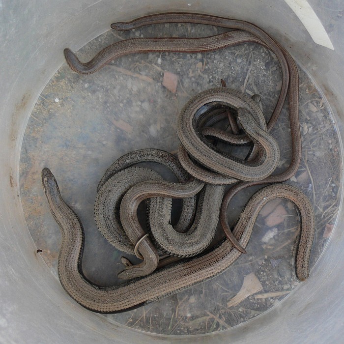 Tak nám do jámy nachystané na nové odpady přibyli hosté, včetně malého miminka. Ty dvě tlusté jsou asi budoucí matky. Odnesli jsme je všechny do nově vybudovaného slepýšího sídliště.