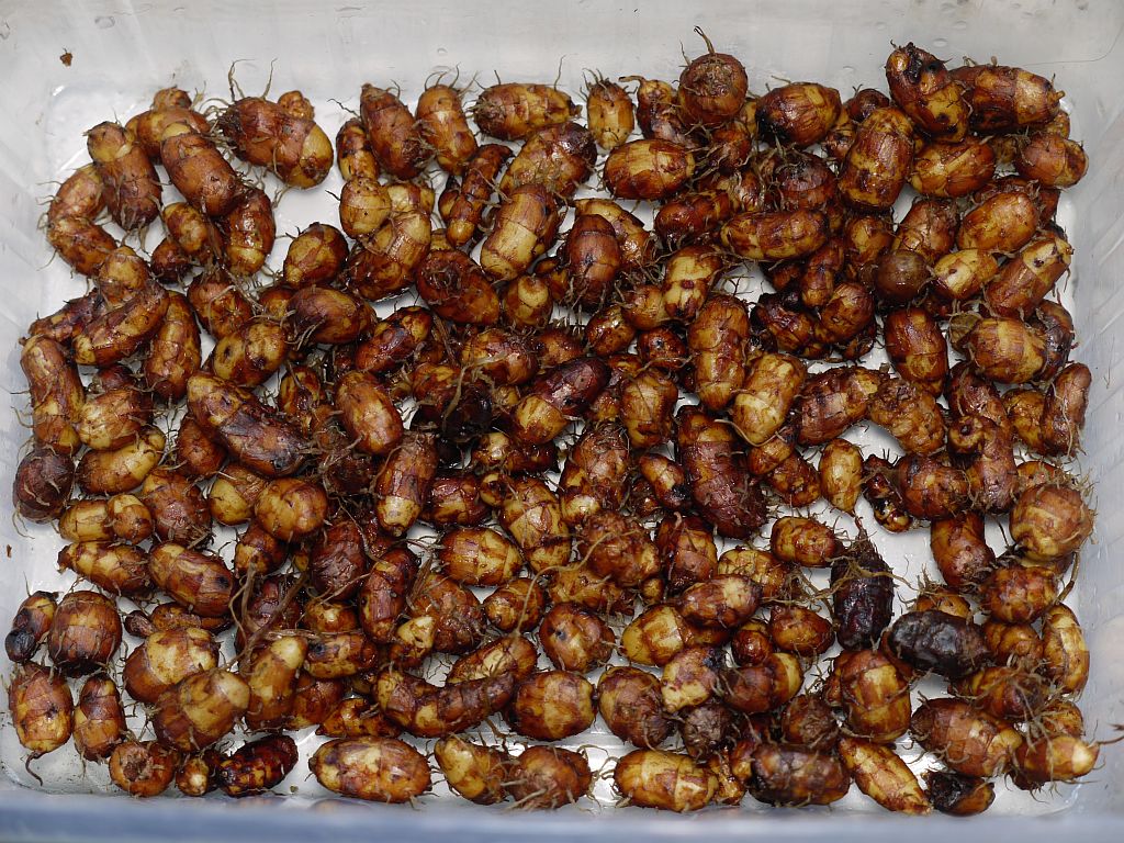 Stejně tak se sklizní, sklízel jsem jej dnes, tedy 6.11.2011. Nať už byla suchá, ale hlízky jsou evidentně v pořádku, akorát že část jich nakousali drátovci. Z těch šesti trsů jsem sklidil asi 250 hlízek, většinou celkem slušné velikosti. Přikládám fotku již vyčištěné a proprané sklizně.