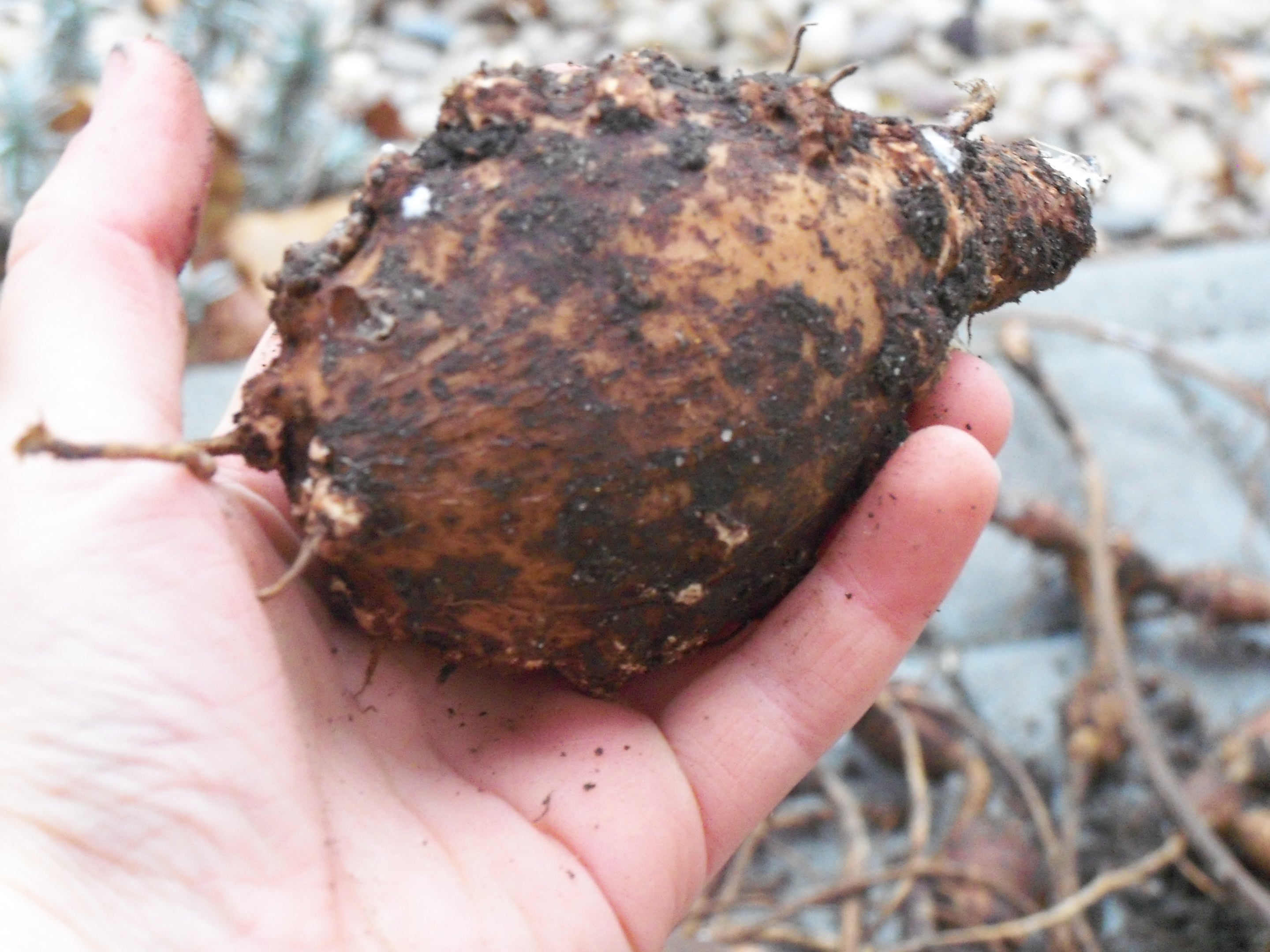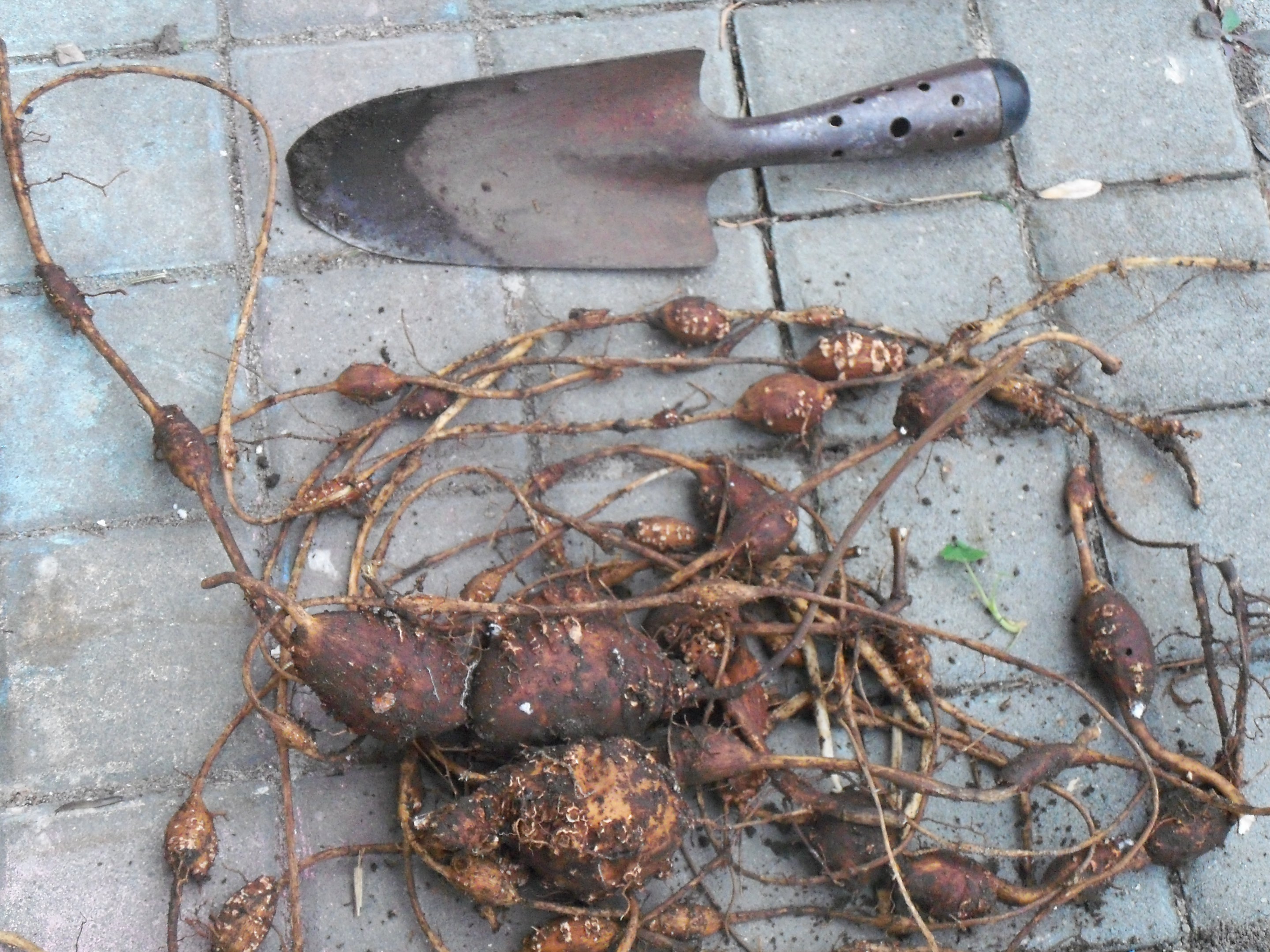 Apios Americana mám druhým rokem, na obrázku je 1/2letošní úrody z jedné hlízy zakoupené na jaře 2010 (cena 150Kč/1hlíza Lokon Glads). Rostlinu mám vysazenou v polostínu ve smíšeném záhoně s trvalkama a popínavkama v normální spíš chudší zahradní půdě.