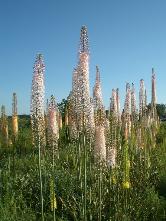 Jen dodám ještě,že Eremurusů je mnoho druhů.Nejznámější u nás mezi zahrádkáři je asi Eremurus stenophyllus /Liliochvostec úzkolistý/ Žluté až 160 cm vysoké květenství a Eremurus robustus /Lilichvostec statný/ se smetanově bílým až narůžovělým květenstvím dosahujícím výšky až tři metry.Květenství Eremurusů je dlouhý hustý klas(u robustus a až 1m) složený z kvítků,který nekvete celý naráz,nýbrž postupně odspodu vzhůru.Je to proto ,aby nedošlo k sebeopylení každého z kvítků.Blizny kvítků se objeví vždy až ztratí své tyčinky a začnou zasychat.K opylení pak dojde z právě nakvítajících dalších kvítků v klase nad nimi,které mají ještě jen tyčinky.V jednom květenství tak lze běžně spatřit různé fáze vývoje květu.Ve spodní části jsou už zahnědlé zrající semenáčky a na špici má květenství ještě poupata.Při pohledu na celé květenství to evokuje představu jako kdyby postupně hořelo ,podbně jako prskavka.Možná i proto je někdy lidmi přezdíván ve své domovině "Pouštní svíce".Dá se množit semeny/dobře klíčí/ a rovněž vegetativně /rozdělěním hlíz/.Rostlina ze semen však začíná kvést až po několika letech.Hlíza má středový pupen/pupeny/ z něhož do stran paprskovitě vyrustájí dužnaté kořeny.Hlíza tak trochu to připomíná "pavouka" či "chobotnici".Rostlina si dělá každé vegetační období celý kořenový systém nový a starý nechá uhnít pod sebou.Květy mají trochu nahořklou ,med připomínají vůni a jsou doslova neodolatelné pro čmeláky,včely a hmyz živící se pylem.Rostlina na zimu celá zatahuje a raší časně z jara.Je otužilá,houževnatá a nenáročná na pěstování.Lze ji najít i ve vyšších nadmořských výškách.Její domovinou /podle druhu/ jsou asijské stepy(Tádžikistan,Kirgistan,Čína,atd.) a pohoří (Pamír,Ťan-Šan,atd).