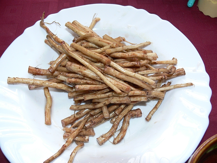 Zkoušela jsem syrové kořeny, vařené kořeny, syrové stonky, vařené stonky. Nejlepší chuť mají vařené oloupané mladé stonky (dokud se ještě dají ohnout, jakmile ztvrdnou jsou vláknité). Poté loupasné mladé stonky syrové, syrový kořen a vařený kořen.