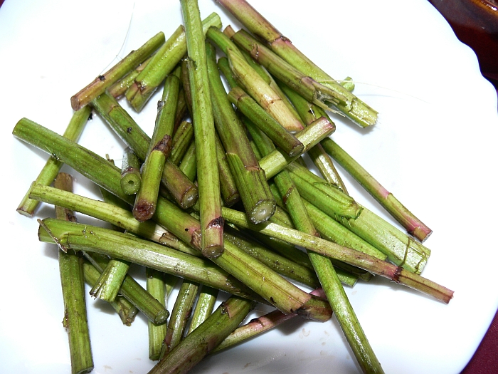 Syrové neloupané stonky nahořklé. Oloupané docela dobré, ale vláknité.