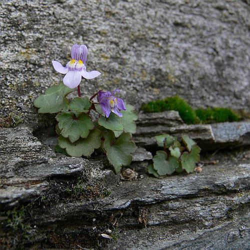 To první je zvěšinec zední, Cymbalaria muralis.
