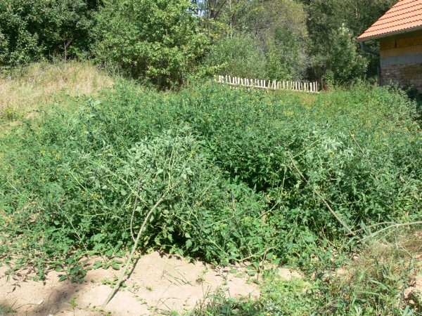 K letošním divokým rajčatům: Ke své škodě jsem tak úplně nevěřila Sklence, když psala o džungli a používala slova jako nepropustná, zahučet do rajčat a podobně. Na vlastní kůži jsem si ověřila, že divoká rajčata opravdu udělají výhony i dva nebo tři metry dlouhé a hojně větvené. Měla jsem je ve dvou řadách, asi devět sazenic (a to jsem se bála že jich bude málo) a ve středu se vytvořila hustá trojrozměrná síť z postranních větví, třeba i 20 až 40 větví ležících vpodstatě na sobě, kam často nebylo ani možné prostrčit ruku za účelem sklizně zralých rajčat. Takže pro mě z toho plyne poučení: sázet v jedné řadě, k opoře.