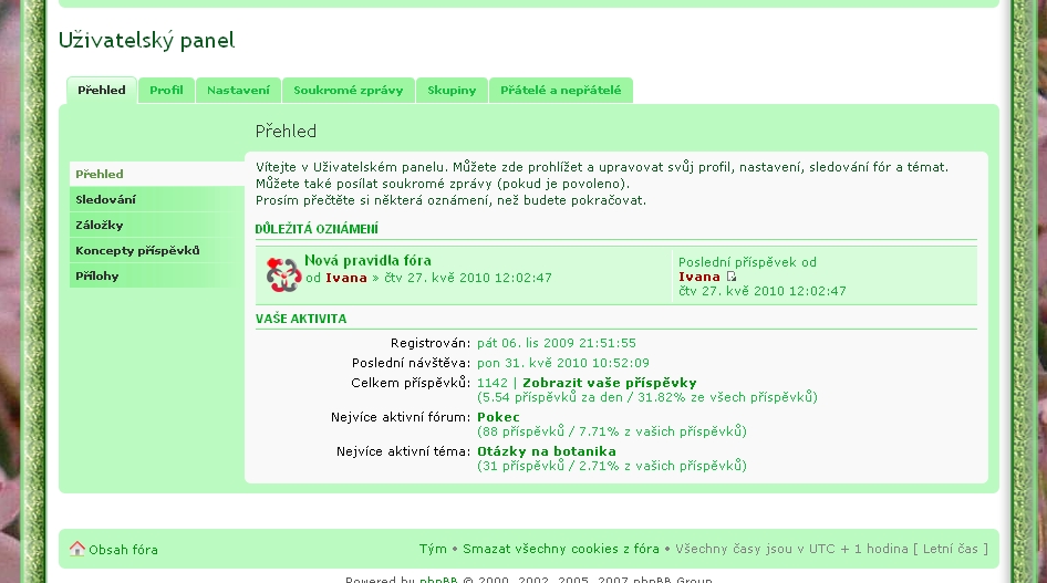Zobrazuje informace o vás, jako je datum, kdy jste vstoupili do fóra, poslední návštěvu, vaše Nejvíce aktivní téma a počet vašich příspěvků. Zobrazují se zde také Důležitá oznámení. Podstránky Přehledu (v levé části panelu) obsahují Sledování, Záložky, Koncepty příspěvků a Přílohy.