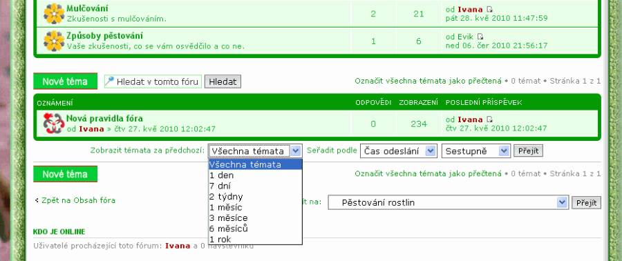 3. Pod jednotlivými fóry jsou dole rámečky na vyhledávání. Pokud vám nevyhovuje způsob jak fórum zobrazuje nové příspěvky, v této volbě si můžete zobrazit nové příspěvky za zvolenou dobu (viz obrázek). Nevýhoda je, že se to nedá vyhledat pro celé fórum, ale jen v jednotlivých fórech (nedá se to tímto způsobem vyhledat pro oddíl Biozahrada, ale pro Rostliny nebo Pěstování rostlin nebo Zvířata ano.
